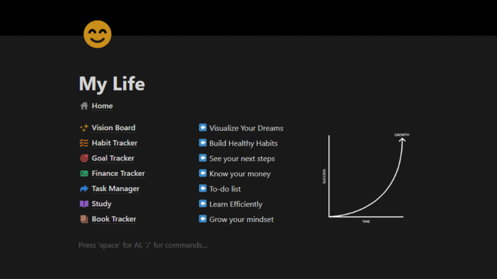 You'll get a Notion Template with 7 Systems to track all aspects of your daily life for maximum productivity (Goals, Discipline, Finance, Study, etc.))